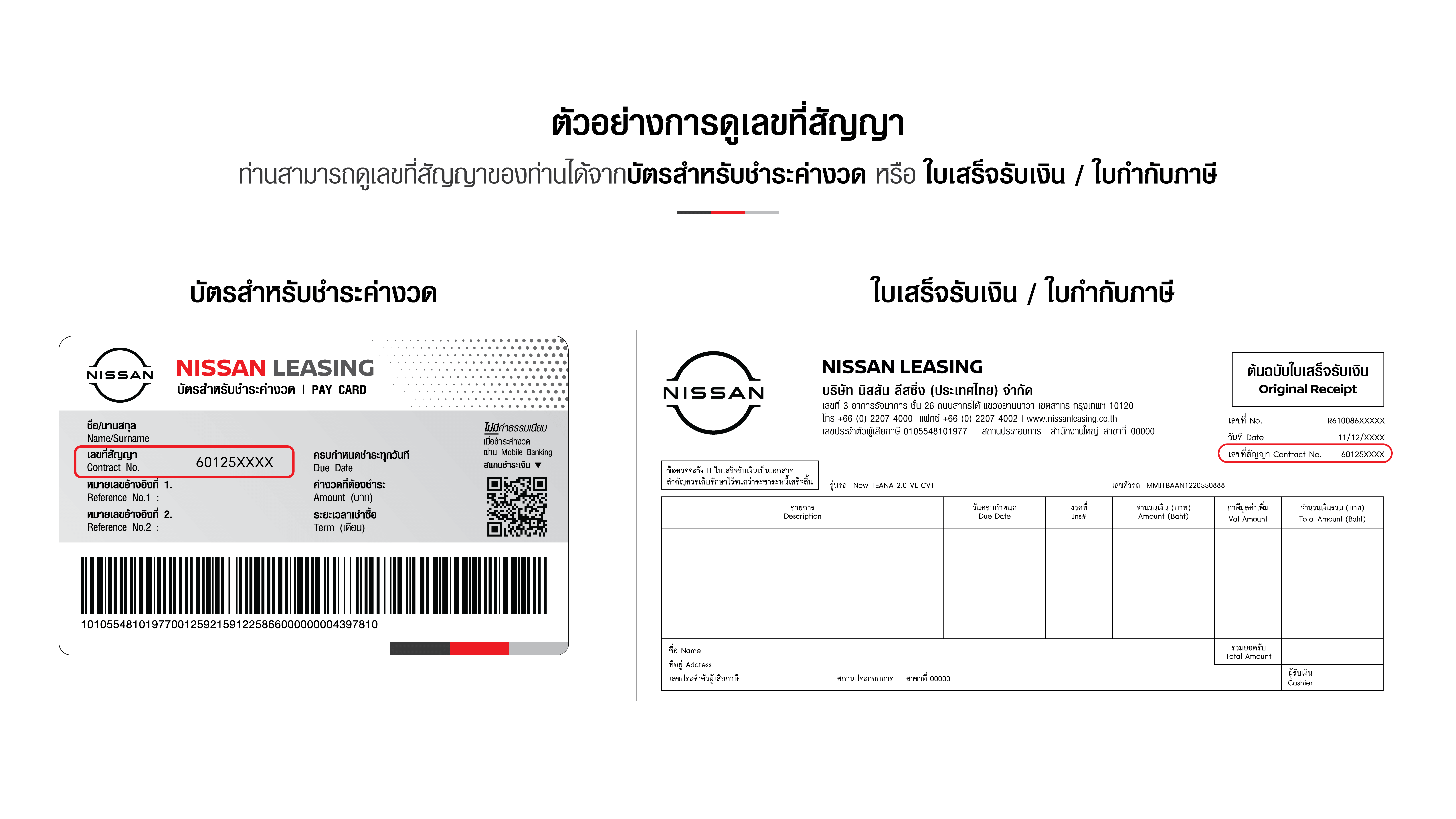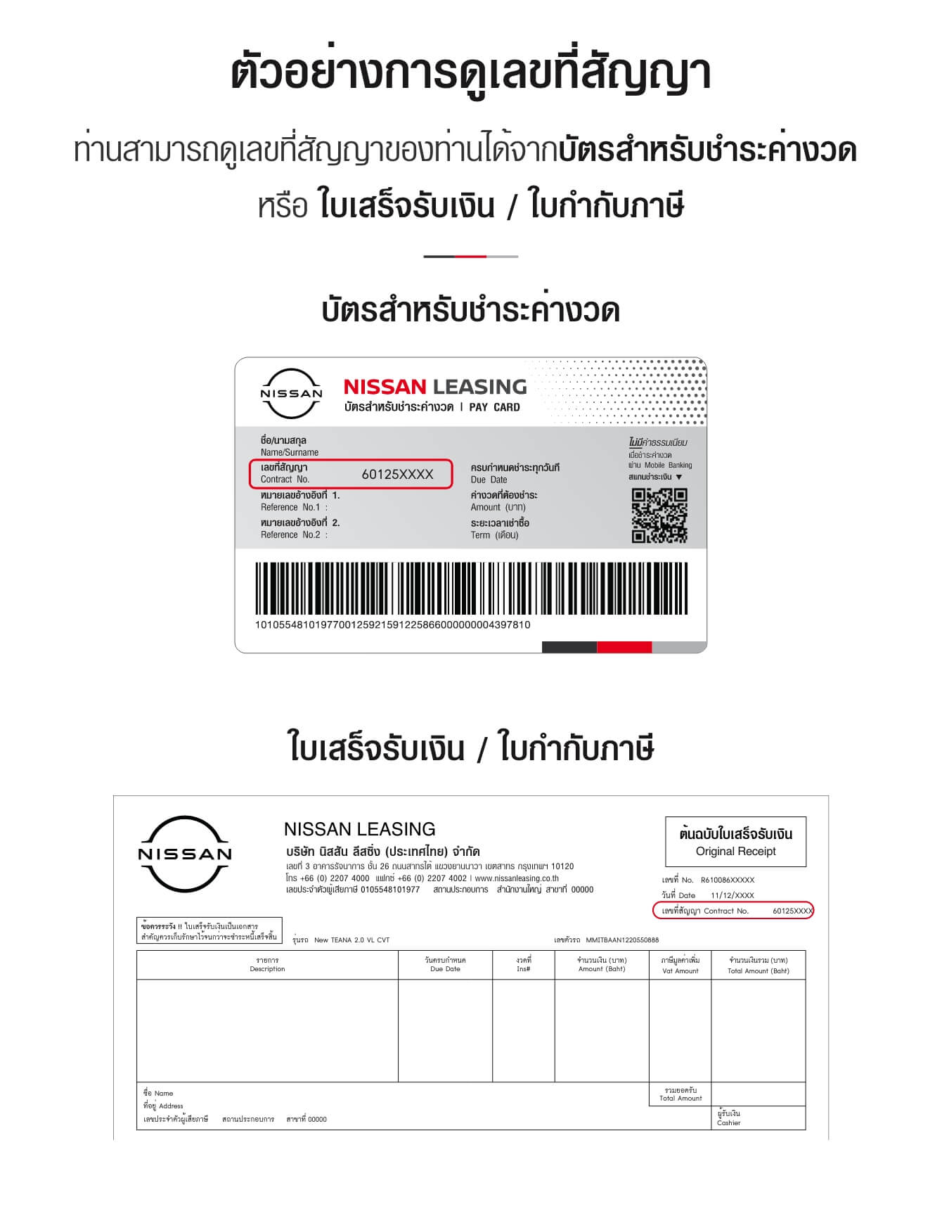 - บริษัท นิสสัน ลีสซิ่ง (ประเทศไทย) จำกัด จะจัดส่ง เอกสารใบเสร็จรับเงิน / ใบกำกับภาษีในรูปแบบเอก สารอิเล็กทรอนิกส์ผ่านช่องทางที่ท่านได้ลงทะเบียนไว้ โดยหากท่านขอรับเอกสารในรูปแบบอิเล็กทรอนิกส์นี้ ถือว่าท่านประสงค์ยกเลิกบริการการส่งใบเสร็จรับเงิน / ใบกำกับภาษีทางไปรษณีย์ตามที่อยู่ที่เคยแจ้งไว้กับบริษัทฯ